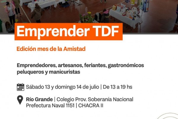 La Secretaría de Economía Popular informa a las y los vecinos de la ciudad de Río Grande que Emprender TDF “Edición Mes del Amista” cambió de lugar y se estará realizando en el Colegio Provincial Soberanía Nacional, ubicado en calle Pr... Leer [+]